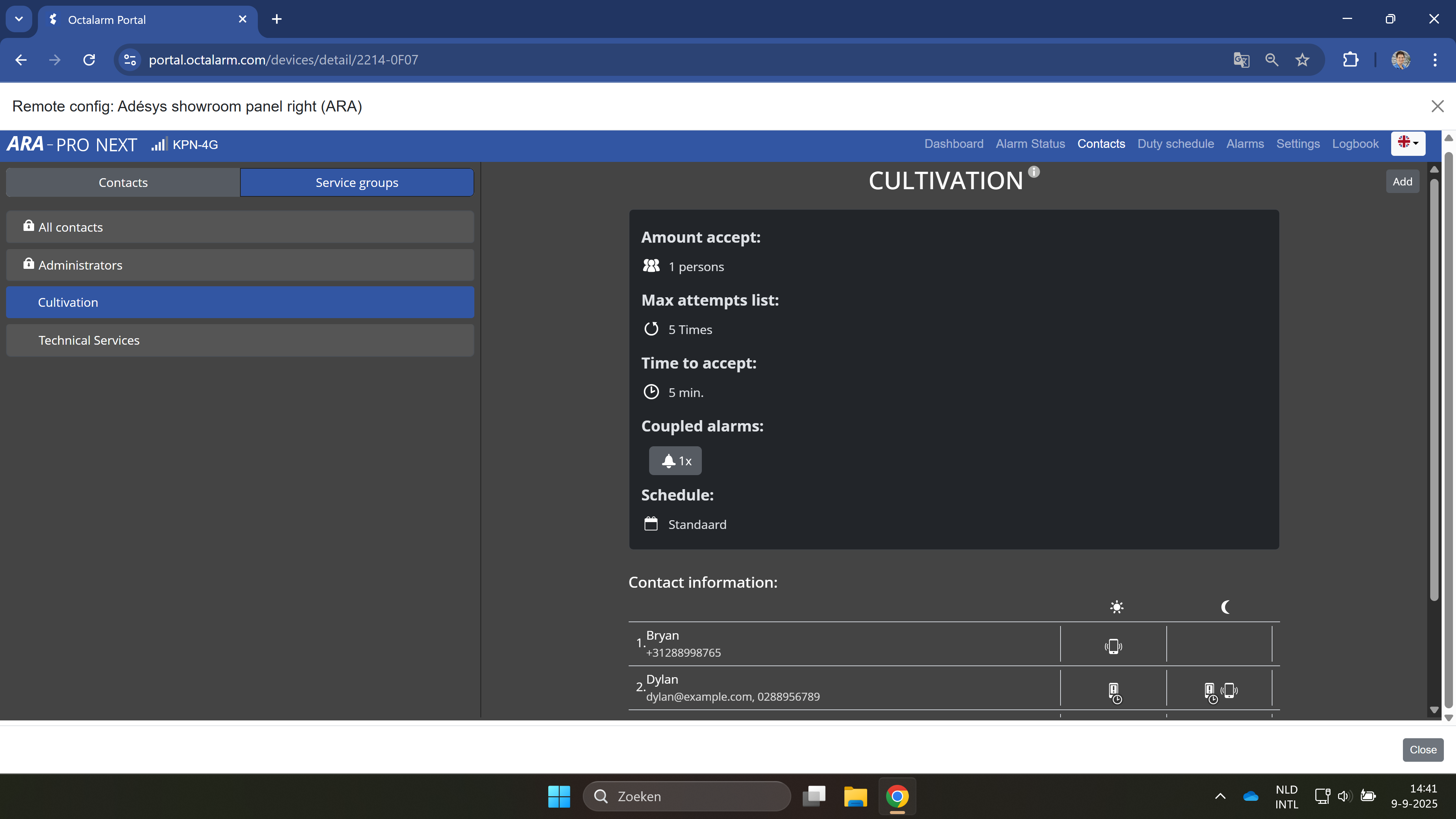 Tip: You can also set up and manage service groups via the portal: portal.octalarm.com | Remote setup (global) and Remote setup (local). We recommend this approach for managing sections of the duty schedule module.